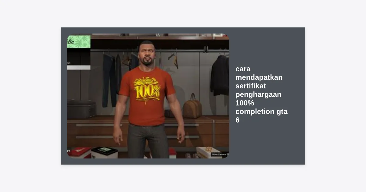 Sertifikat penghargaan 100% completion adalah pengakuan digital (dan terkadang fisik melalui Rockstar Games Social Club) yang diberikan kepada pemain yang berhasil menyelesaikan seluruh konten yang dipersyaratkan dalam game. Dalam sejarah seri GTA, mencapai 100% tidak hanya memberikan kebanggaan pribadi, tetapi juga membuka berbagai fitur rahasia, kendaraan unik, dan tentu saja, status elit di komunitas global.